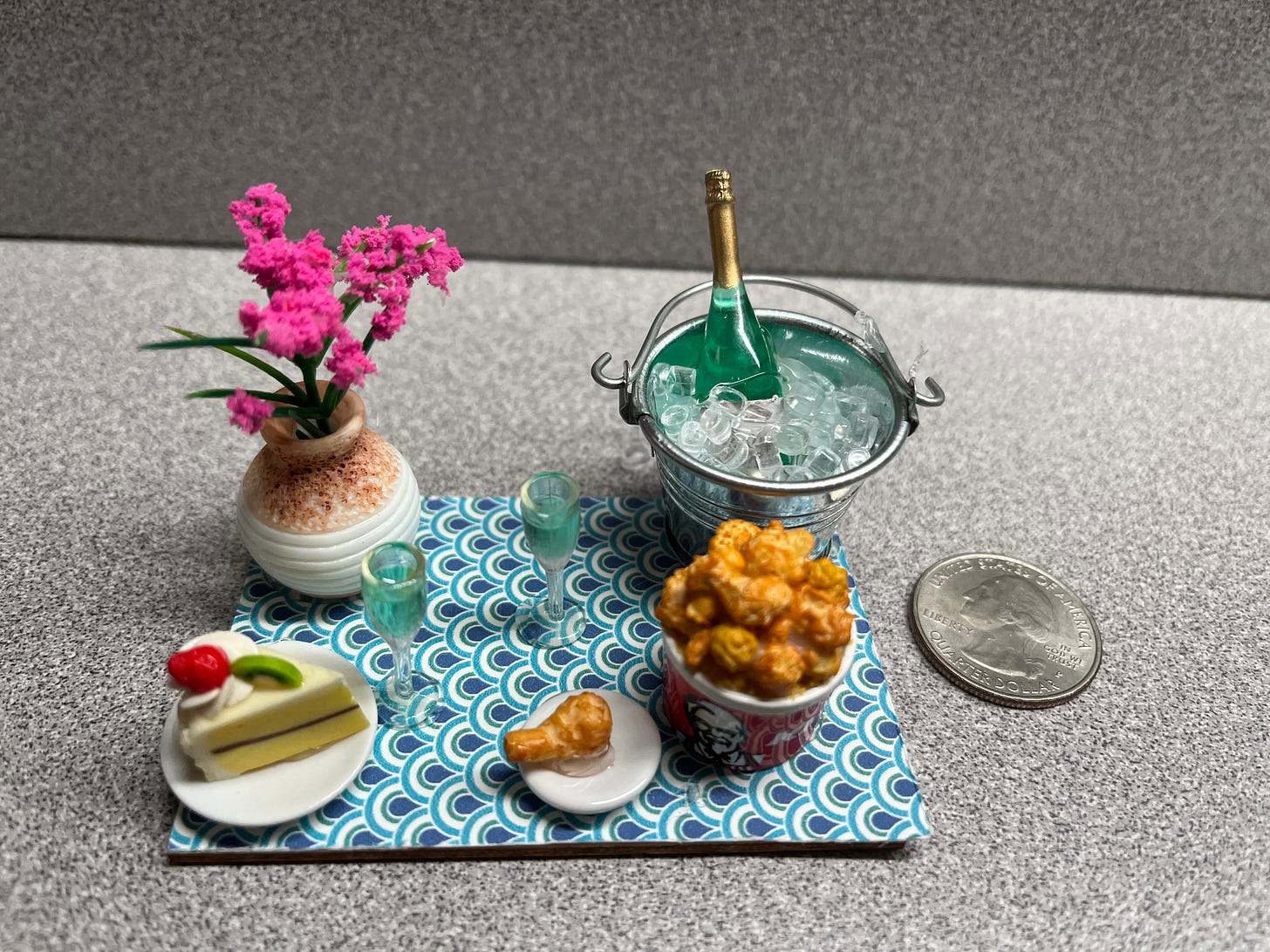 I pulled the dollhouse out for my daughter when she was little and loved setting it all up with her. But it’s sat there for awhile, untouched. Then I started this book about family and summer and all the little things (literal and other) that we get from the people in our lives. And before I knew it, I was on Etsy, freaking out over tiny little buckets of chicken and champagne. I mean, look!