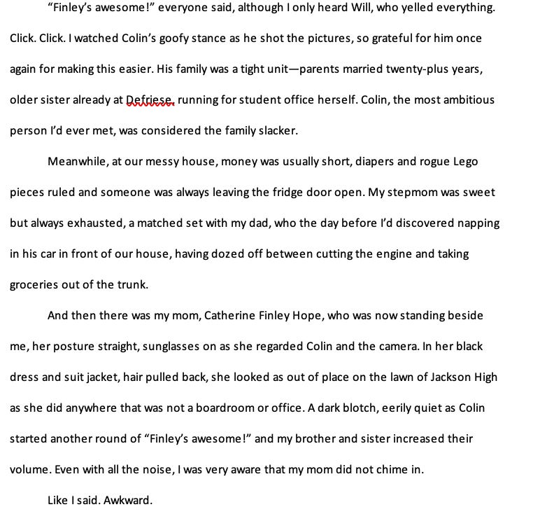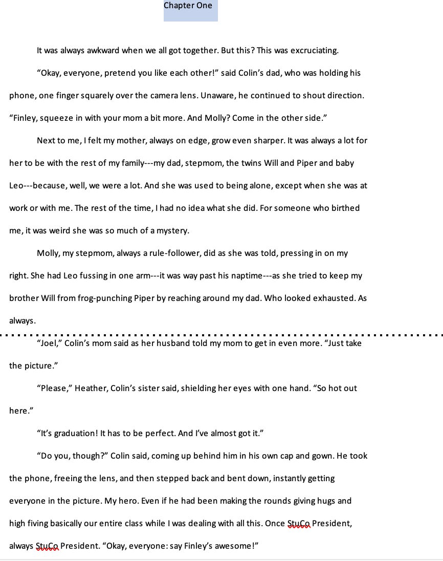 But this release has been harder. So many little things I loved among those pages. Hopefully I will find them another home. But just so I can say *someone* saw it, here’s the opening pages of a book I called Change of Plans. My agent said I should throw it in the trash (she is brutally honest) but this feels better. Finley, I let you go with love. Godspeed!