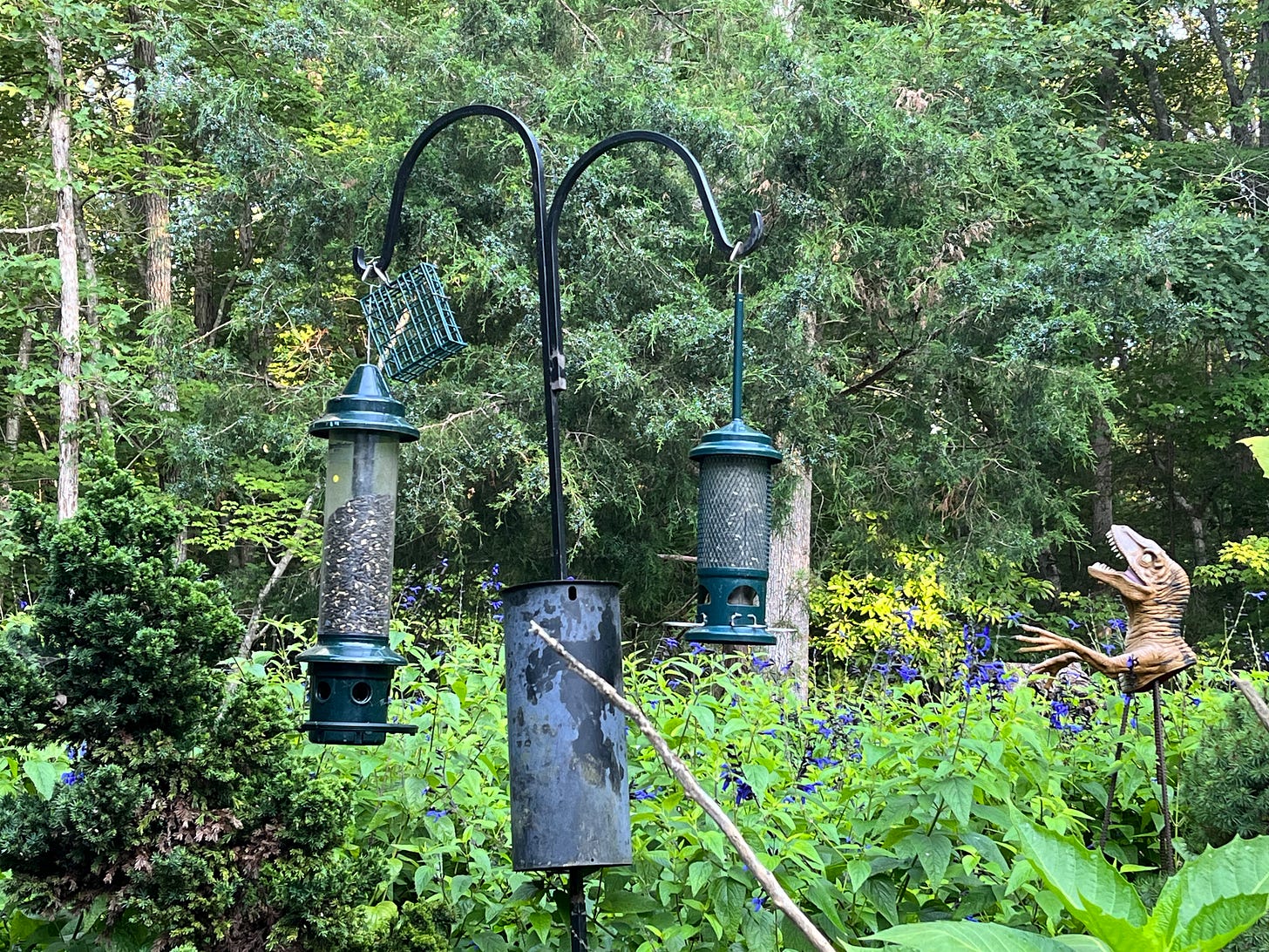 It’s 7am and I just went out to check on my birds and the pole was down, feeders flung all over the place. My first thought was: BEAR? Second: no, probably a possum. Maybe a raccoon. But a bear has been spotted by our neighbors and ever since my husband is DETERMINED to see one. The other day we were driving past the swing set and I saw the biggest hawk ever. I was like, “LOOK!” and he got all excited thinking it was a bear. I can’t deliver a bear. I can’t even get anyone to answer my phone calls. But I can pick up my feeders and try again.